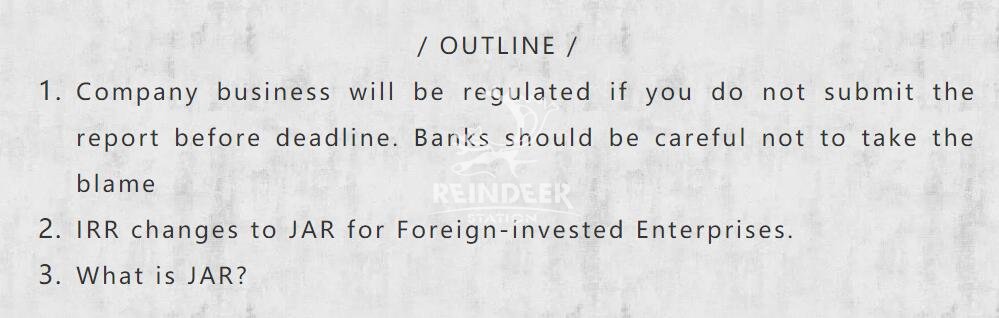 The FDI Inventory Rights Registration (IRR) of Foreign-invested enterprises has been replaced by Joint Annual Report (JAR), which has to be finished BEFORE 6.30. It is less than 1 month before the deadline! Companies who do not submit the report accordingly would be regulated and penalized by the Foreign Exchange Bureau (FEB). What we should emphasize here is that some companies do not know the existence of the IRR and JAR or somehow managed to ignore them completely. For example,some domestic enterprises did not continue the business after setting asubsidiary company, which resulted in it being regulated and put into the ‘blacklist’.There is no doubt that they will be regulated and penalized. Regardless of whether they operate domestic business or not, foreign investors should always submit their registration and report before the deadline. Anyway, all the foreign investors who have once registered ODI, FDI or Return Investment should submit the IRR every year!